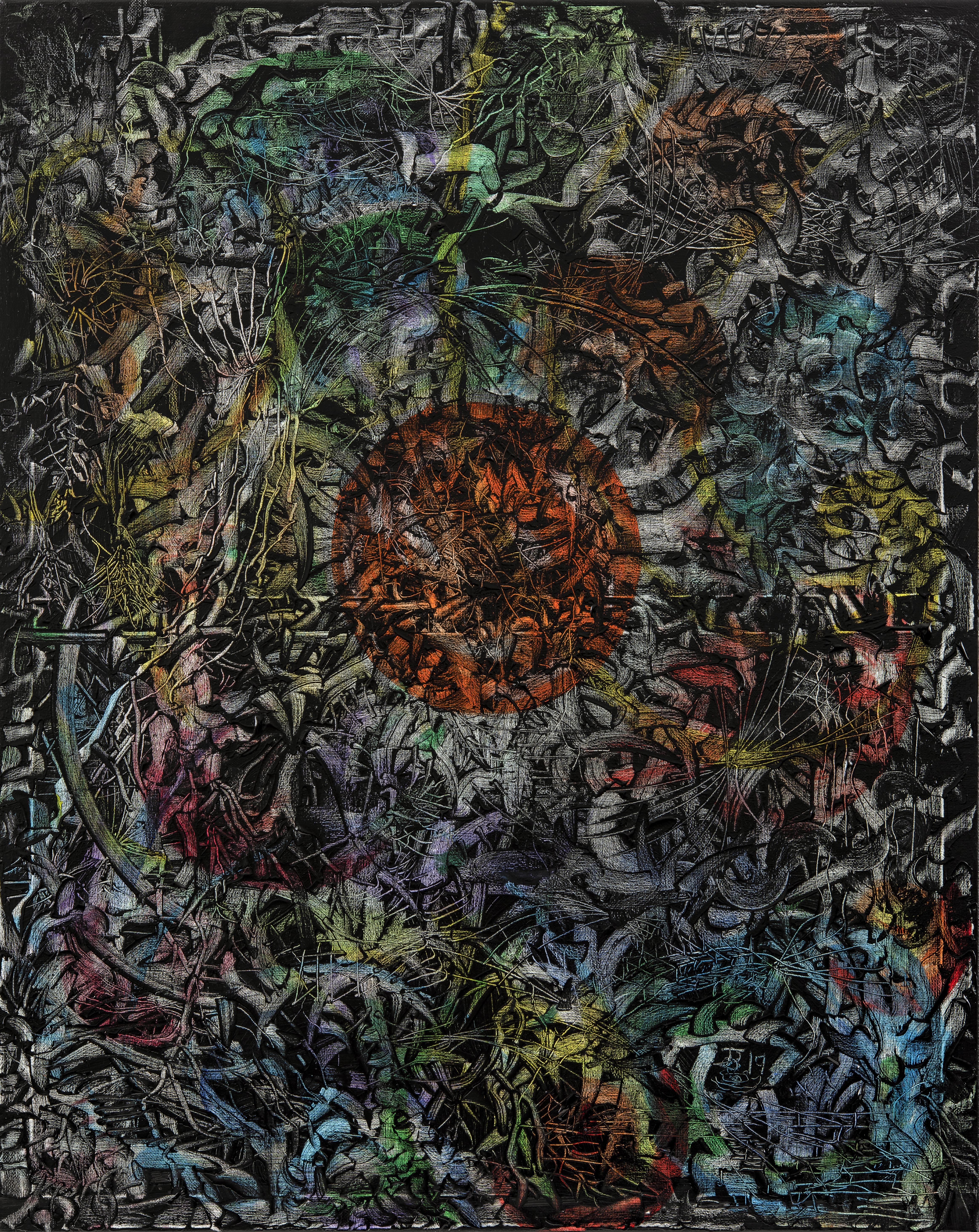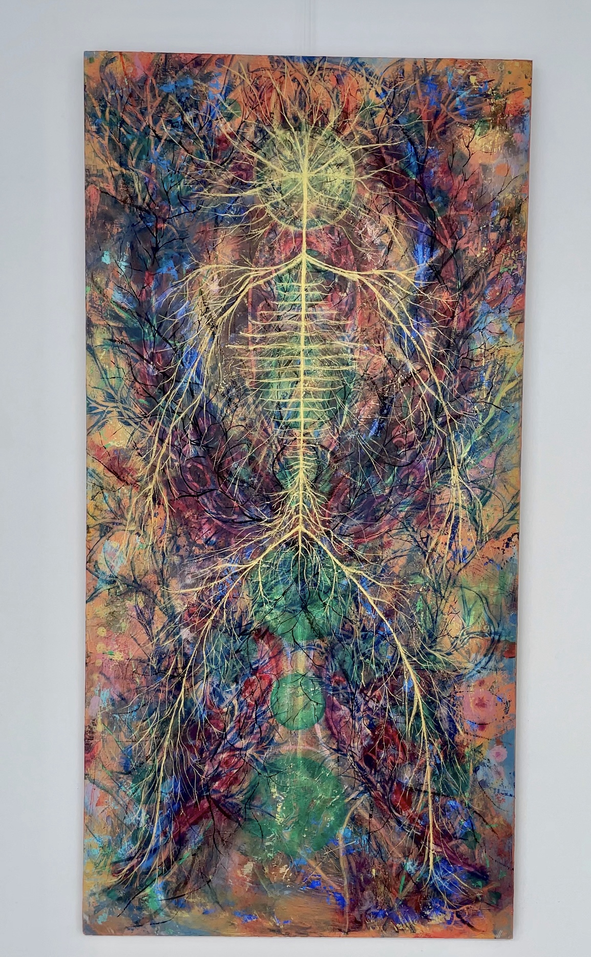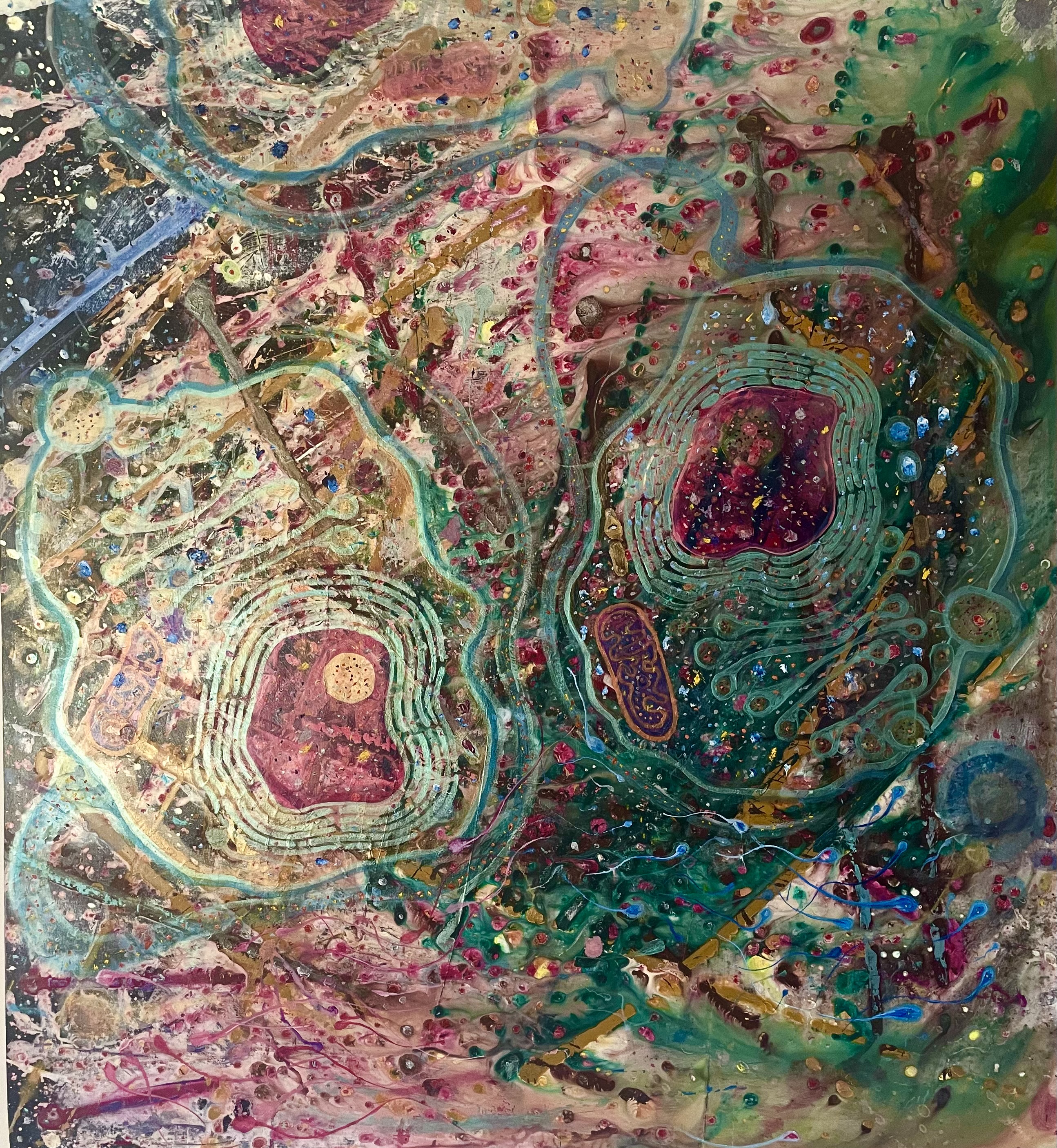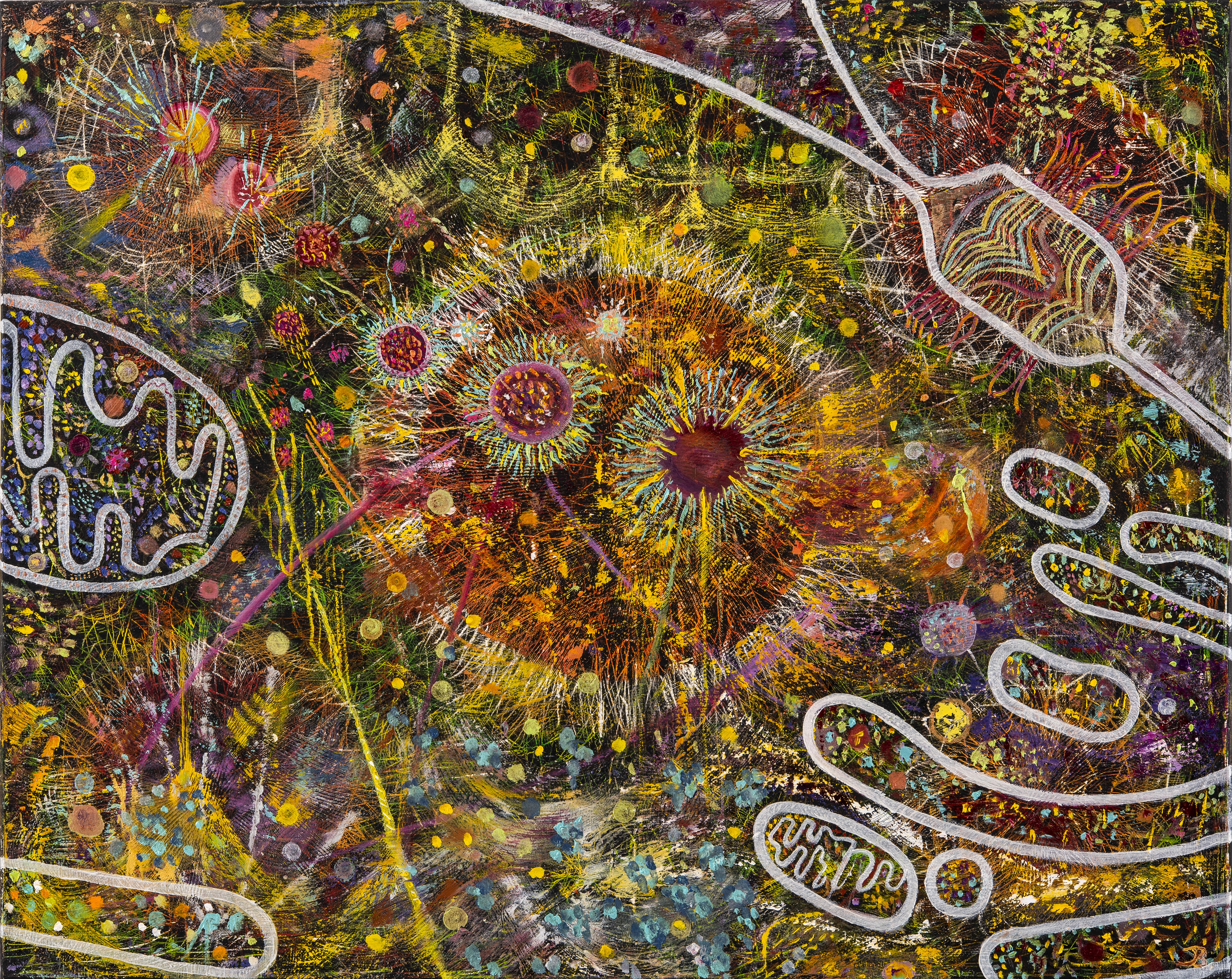 Although deliberately not adhering to any particular painting style, Jonny’s most recent and current work has been in creating bright, immersive and evocative paintings, drawing inspiration from his fascination of life in its microscopic form and how the observed patterns, energies and formulas of this cellular world often mirror life in the heavens above us, on an interstellar level. The microcosm and macrocosm residing within us.
